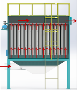 布袋除尘器由灰斗、中箱体、上箱体、进出风管、滤袋与框架、喷吹装置、排料机构、电控系统等部分组成,中箱体可为分室或分组结构。工作时,含尘气体由进气口进入灰斗通过滤袋时,尘气得以分离,粉尘阻流在布袋外表面,净气则经过滤袋进入上箱体,再经上箱体上部出口、由风机排出,粉尘积附在滤袋内表面,且不断增厚,使收尘器的阻力不断上升。当控制柜时间继电给出清灰信号时,脉冲阀按事先设定的程序逐排启动电磁脉冲阀,脉冲阀得到信号后,瞬间释放压缩空气,并引射周围空气形成强大的气流对布袋进行反向清灰,清理附在滤袋外表面的粉尘,粉尘在重力的作用下沉入灰斗料仓,由卸灰阀排出。清灰结束后,滤袋又进入过滤状态。